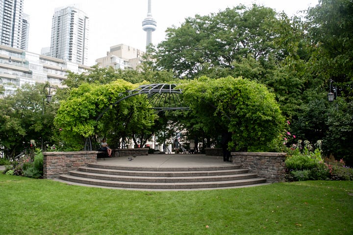 Crossing over to York street, his familiar irritation flared as he walked by Love Park. What sort of love lives in the middle of the road with all this noise? If anything, the Music Garden should be called the Love Garden, he muttered.
