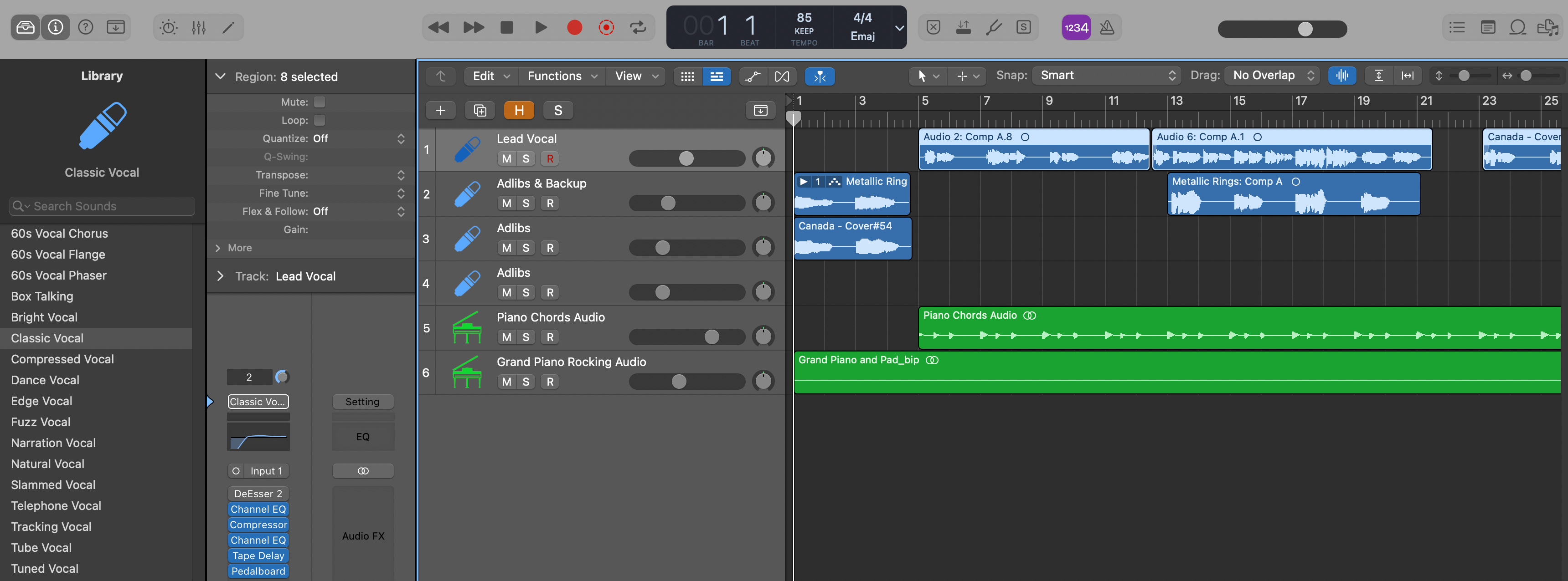 Once all the recording was done, I applied one of the stock vocal effects to my vocals which uses equalization to remove low end & some high-end frequencies that are not needed, and compression to make sure the high parts of the audio are not too high compared to other parts of the audio and the lowest parts are not too low either. It also applied Tape delay and pedalboard to add reverb, giving it that echo effect you have in a concert hall. You could apply all of these individually and tweak them to your heart’s content. But I do not understand these enough just yet, to make any custom adjustments.