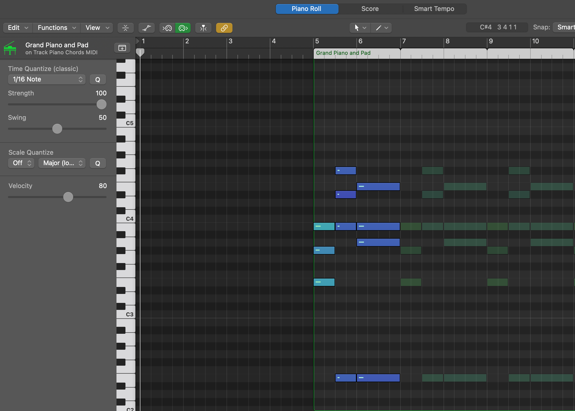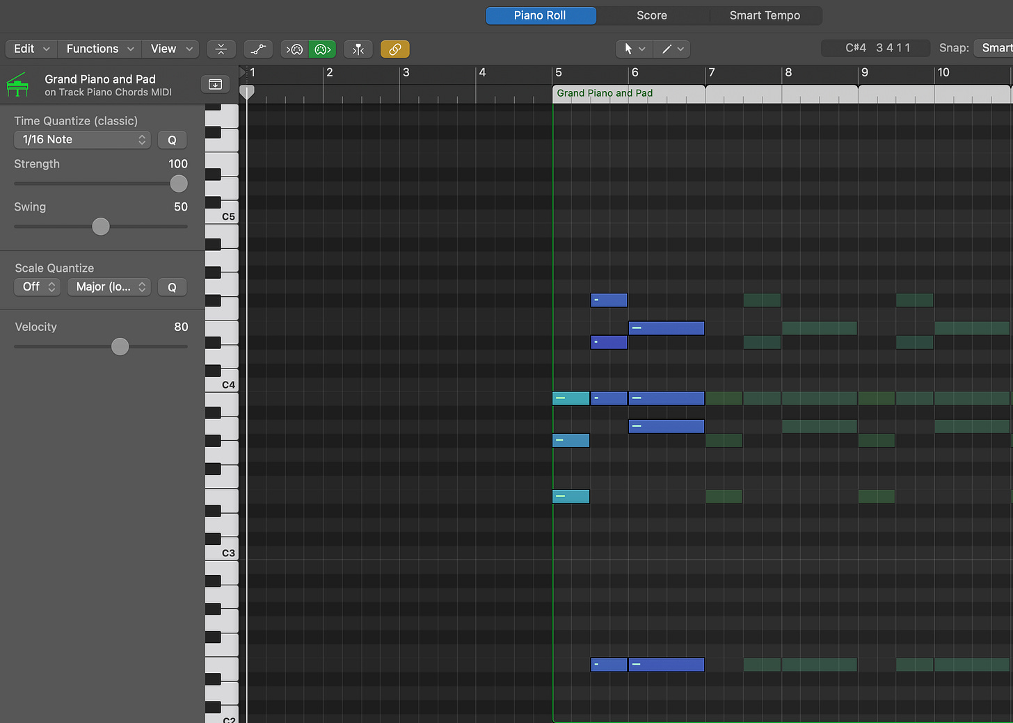 When I played and recorded my keyboard into Logic Pro a couple of times, it was off. I either hit some keys too slow or too fast, and it wasn’t quite in sync with the metronome. After multiple tries and a lot of frustrated sighs, I had a light bulb moment. I played the chord progression once and simply used the piano editor in Logic Pro to make sure that each key was within the grid that matched the beats per minute of the song. Then I just looped the chords since it’s the same thing throughout the whole song. I should have done that from the beginning but we live and we learn. Despite the initial roadblock, I was pleased with the results.