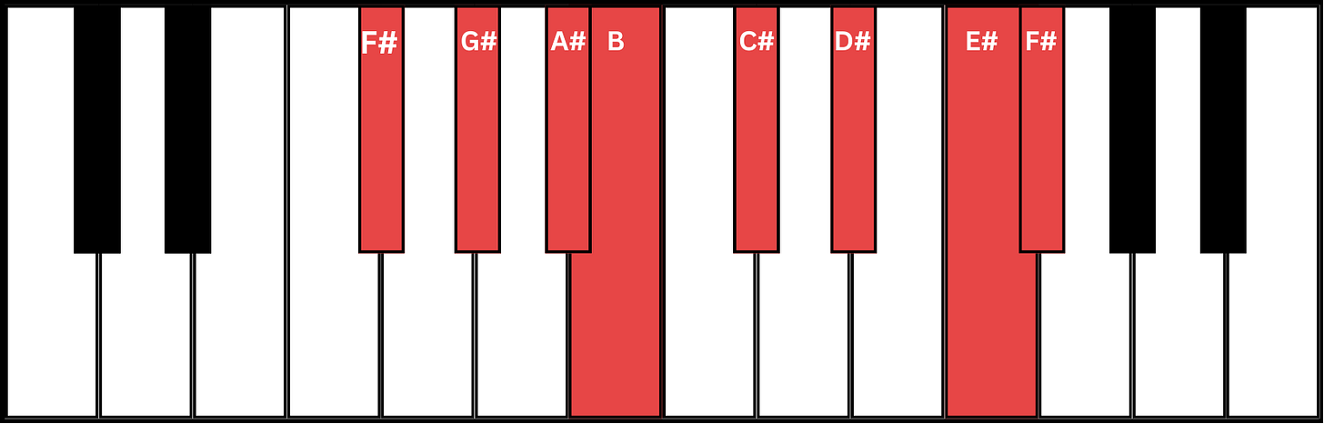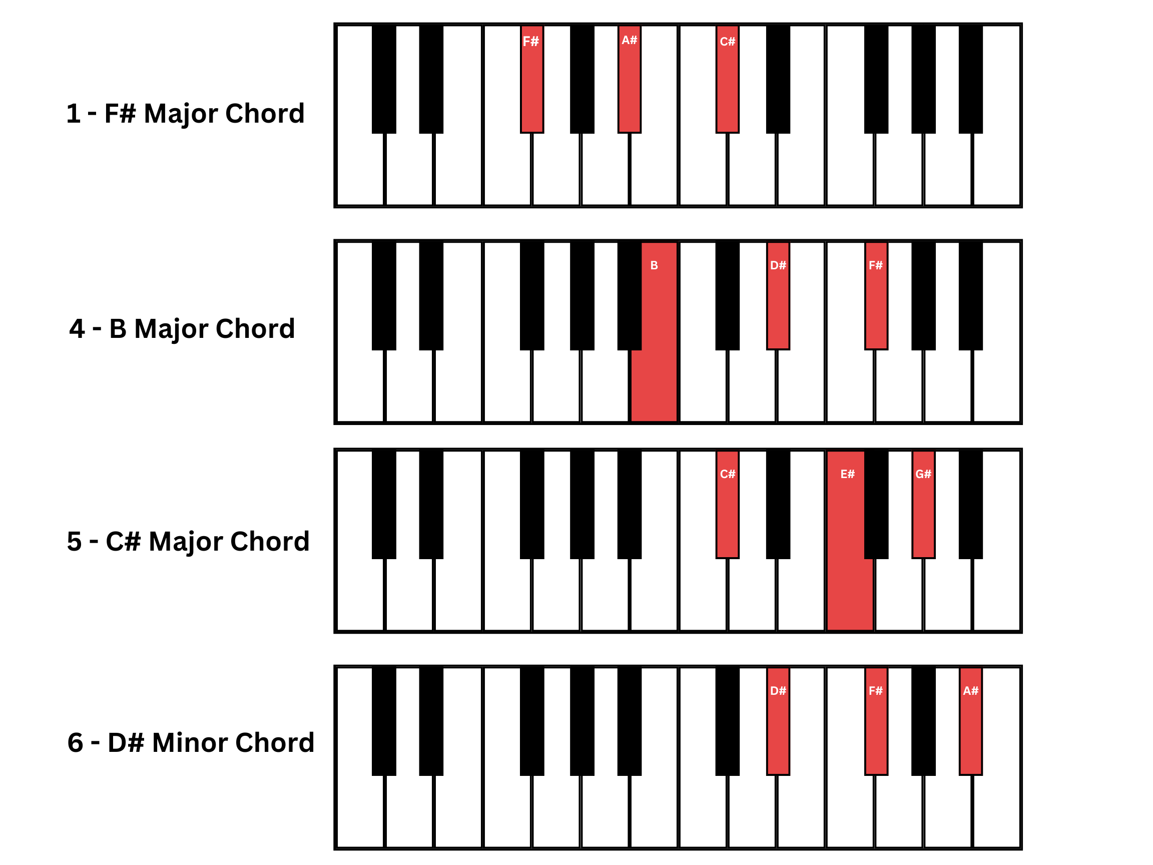 You know the drill by now. The keys in F# major scale are F#, G#, A#, B, C#, D#, and F. So 1 would be F# (F# major chord), 4 would be B (B major chord), 5 would be C# (C# major chord), and 6 would be the D# (D# minor chord).