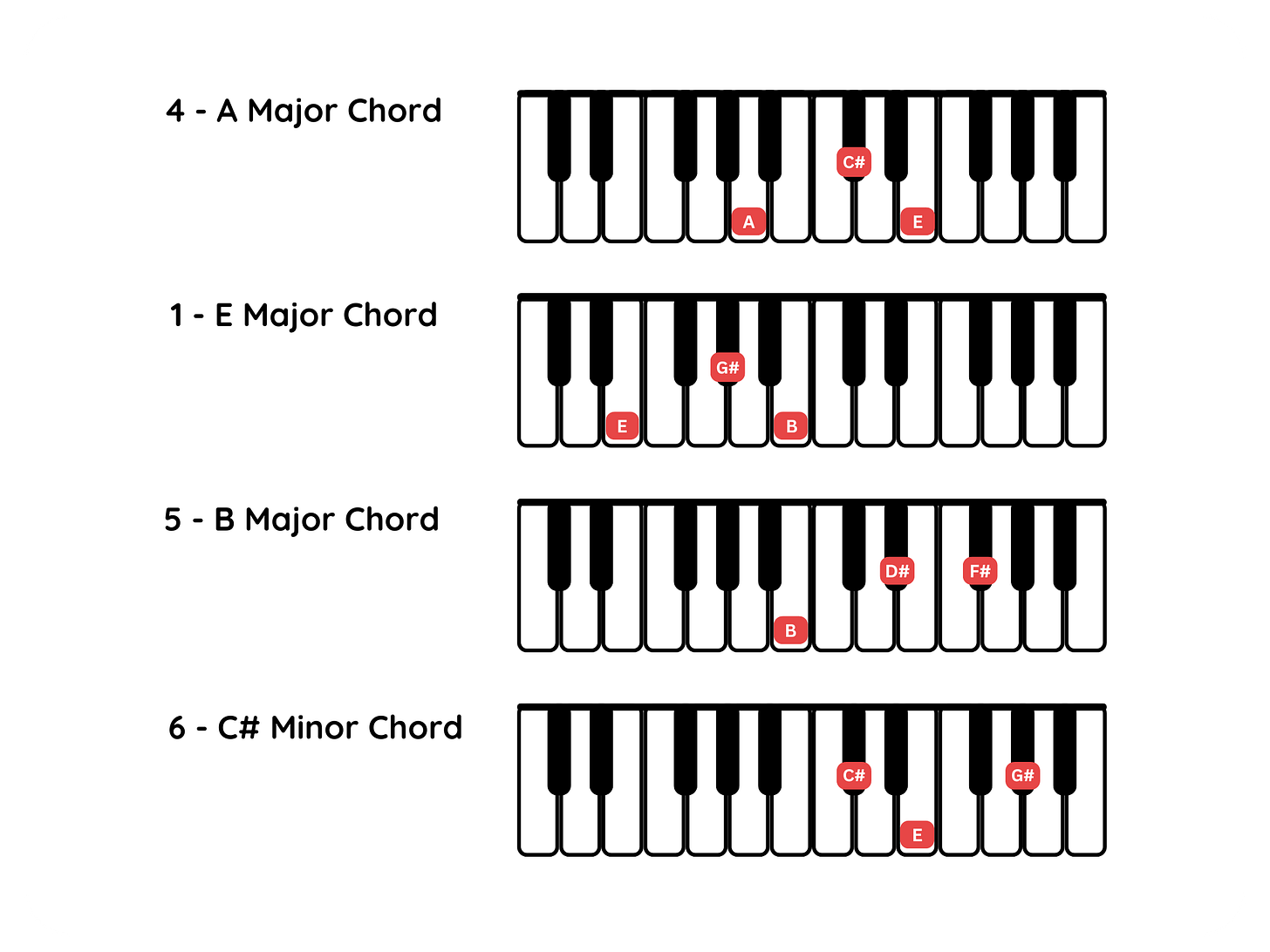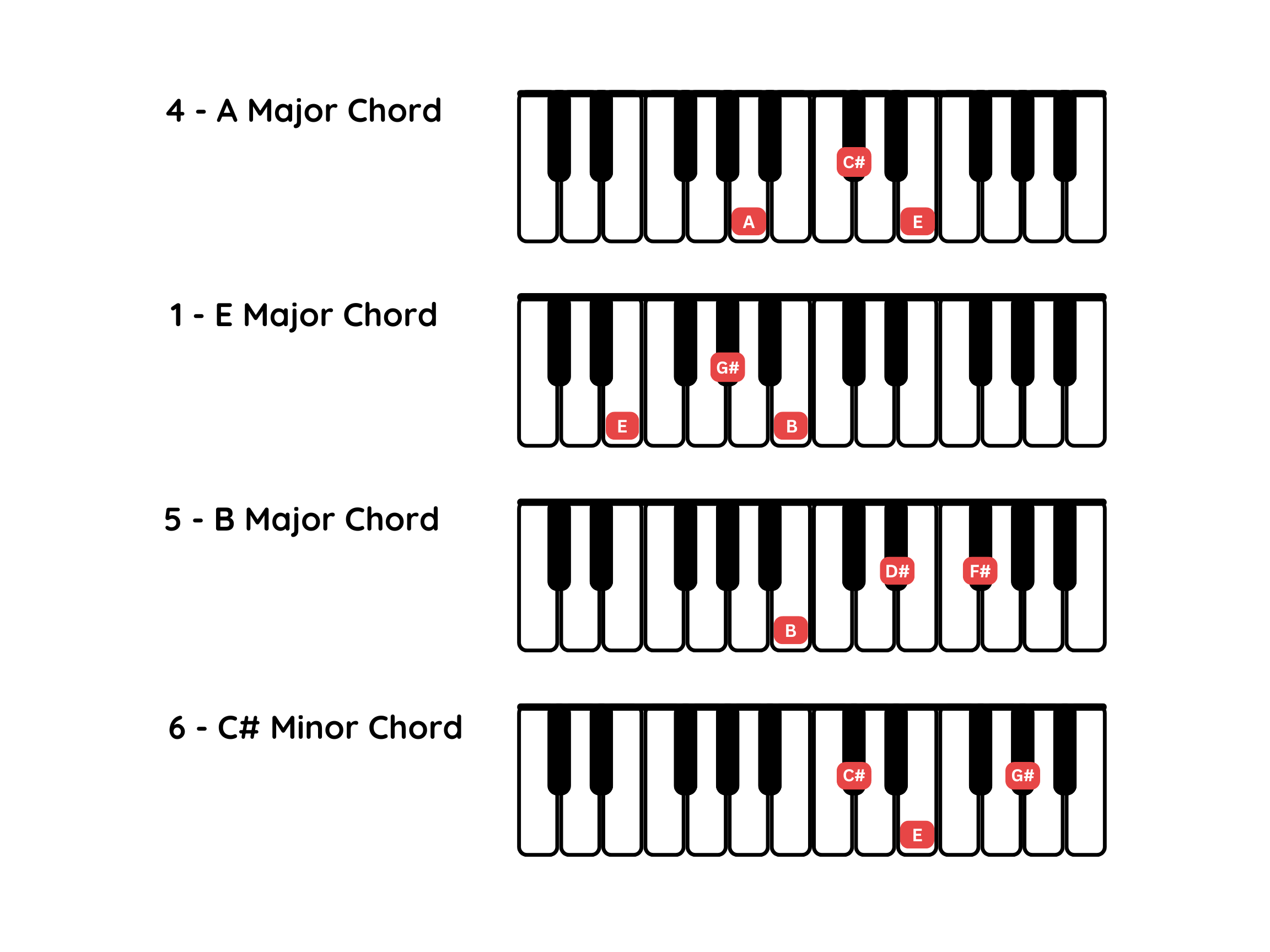 The keys in E major scale are E, G#, F#, A, B, C#, and D#. So 4 would be A (A major chord), 1 would be E (E major chord), 5 would be B (B major chord), and 6 would be the C# (C# minor chord).